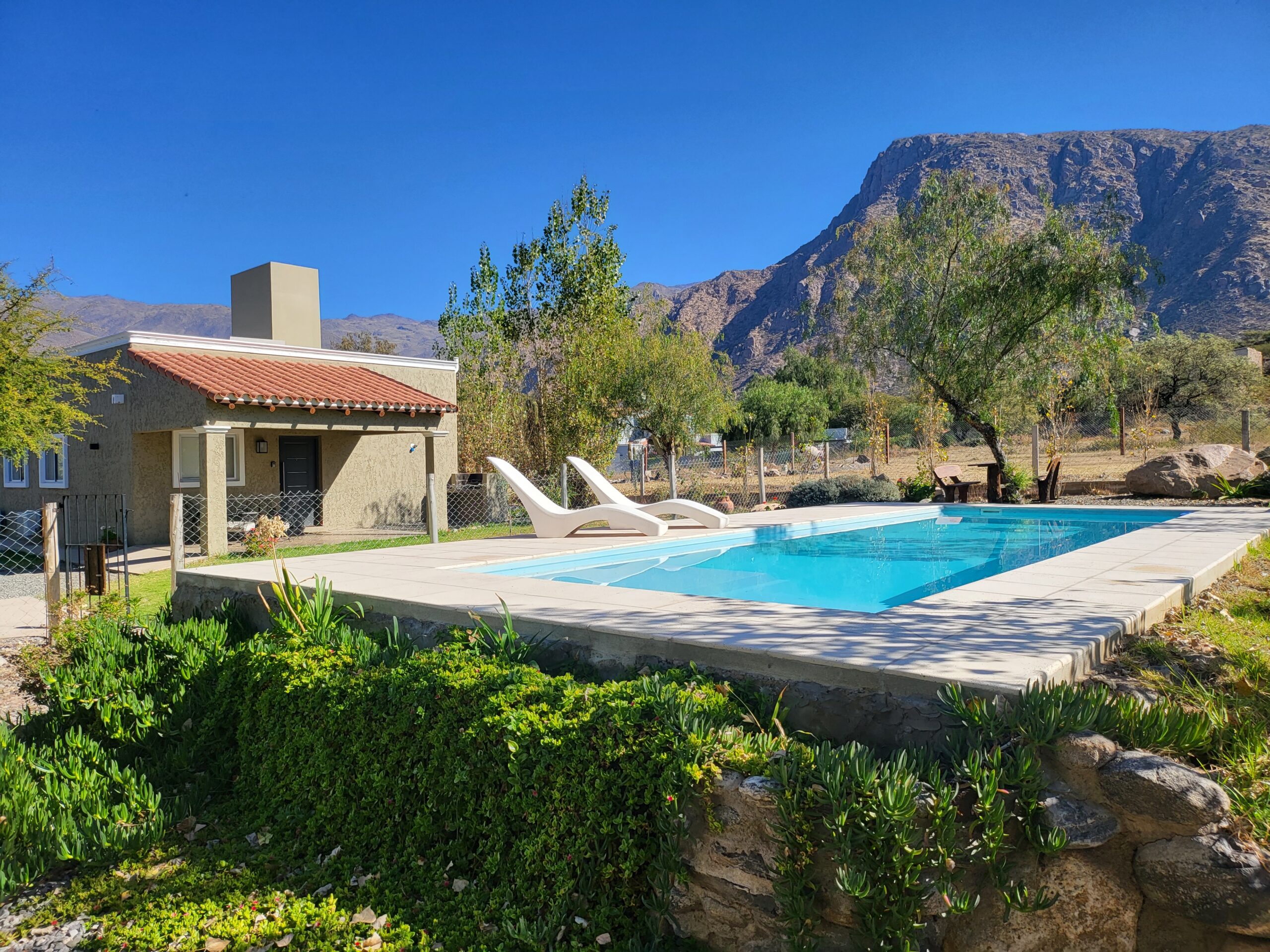 Hermosa casa de 45m², en Club de Campo Vertientes, con 1 dormitorio, para un máximo de 5 personas. Estacionamiento, galería con asador y vistas panorámicas. Sector de juegos para niños y amplia piscina compartido con Casa Malbec II y Torrontés.